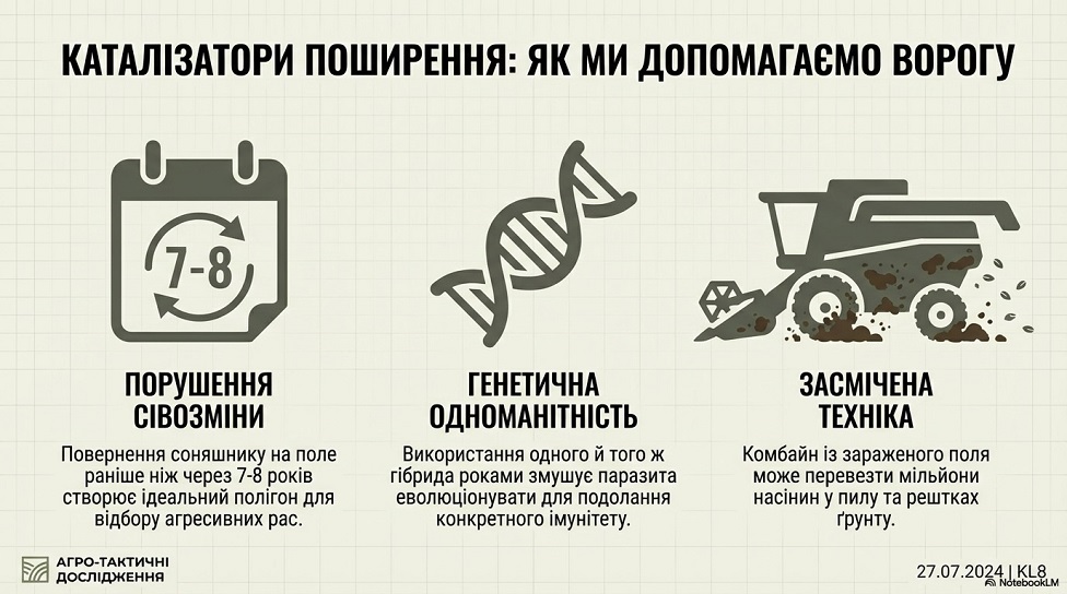 - Сокращение севооборота – возвращение подсолнечника на то же поле раньше, чем через 7-8 лет, создает идеальный полигон для отбора наиболее агрессивных семян.