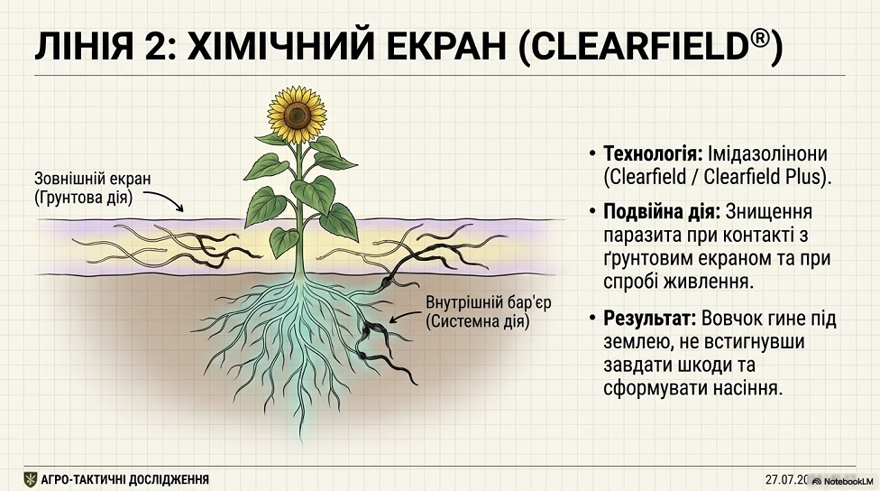 - внешнему почвенному экрану: гербицид фиксируется в верхнем слое почвы. Когда микроскопическая нить заразихи прорастает и движется через этот слой, она впитывает яд еще до того, как коснется корня культуры.